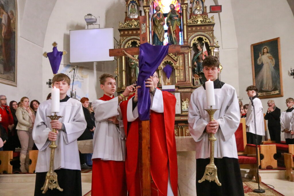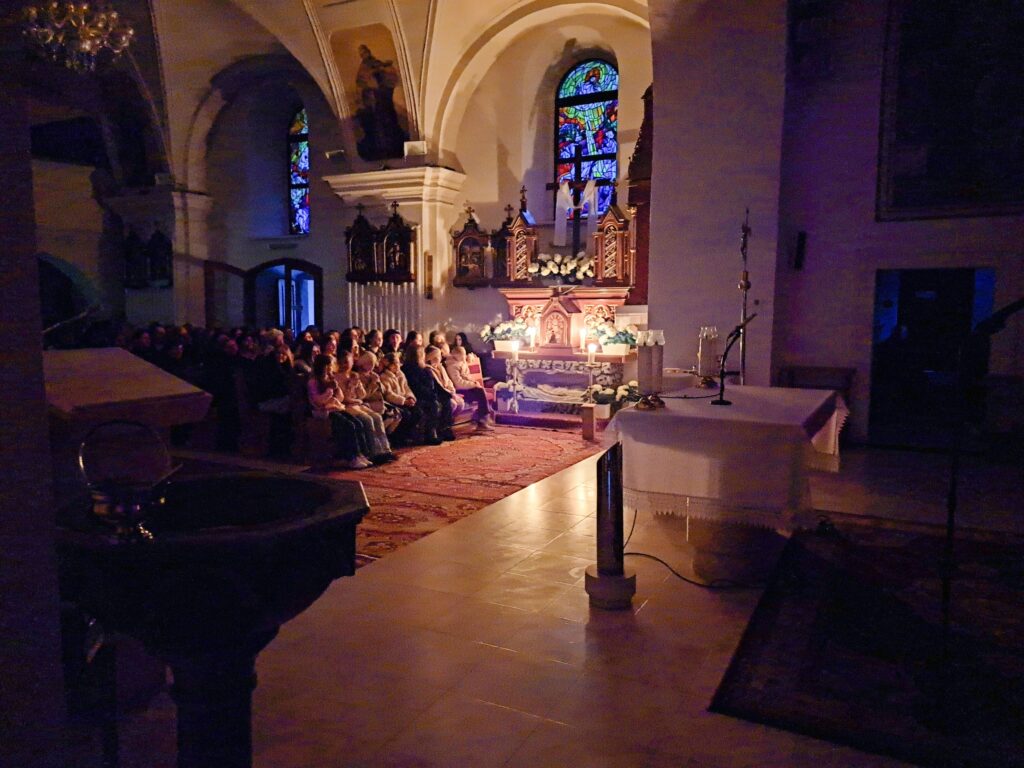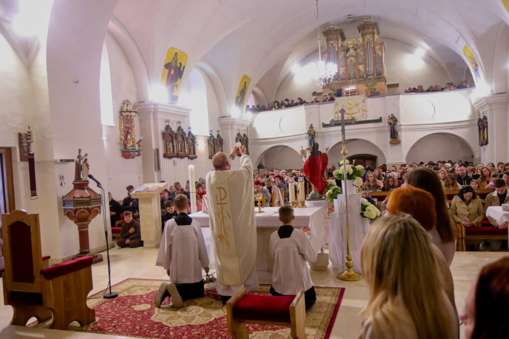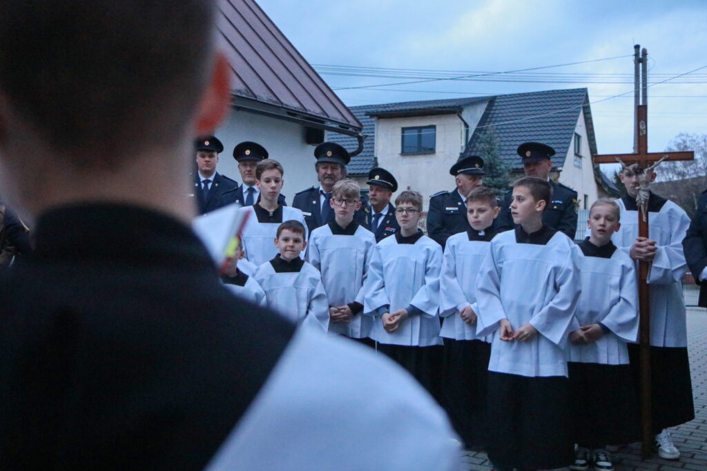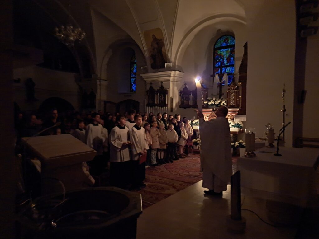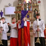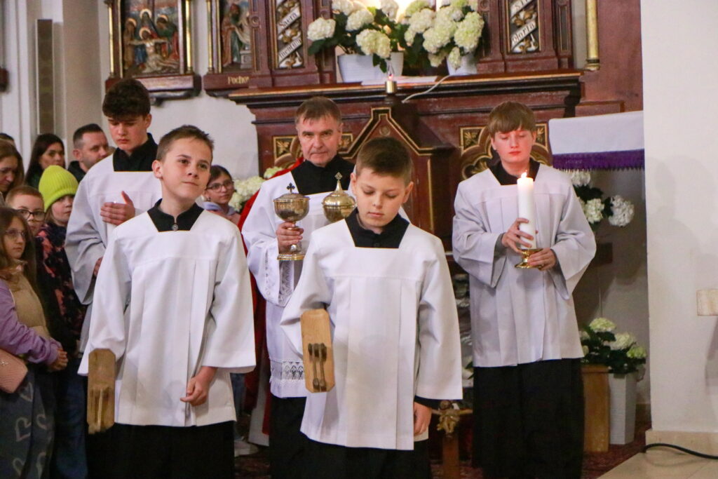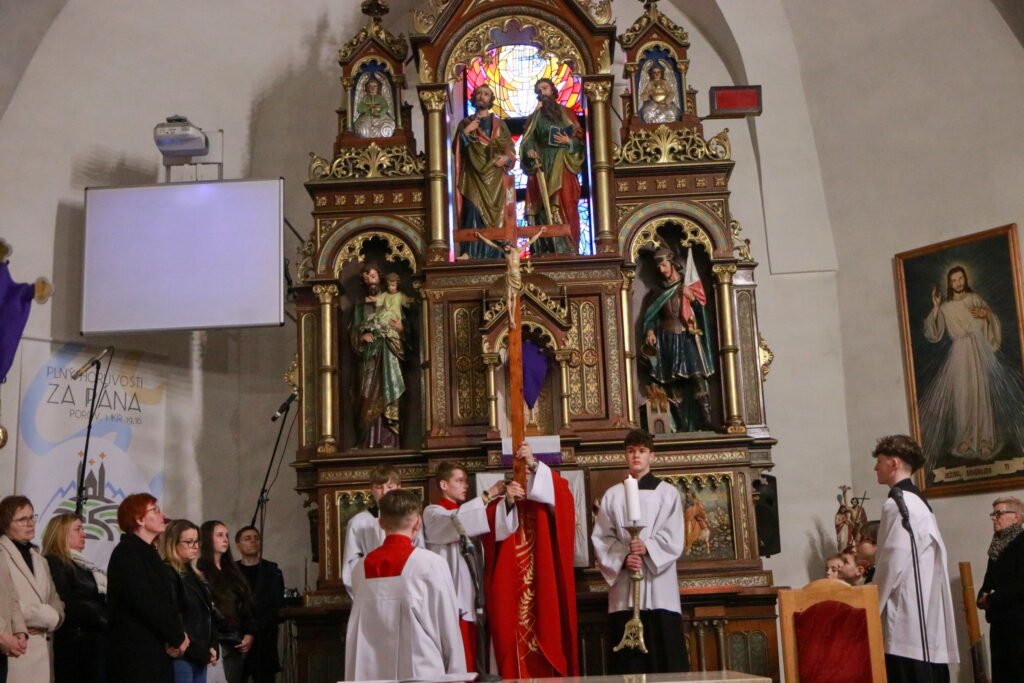 Na Piatok utrpenia Pána (Veľký piatok) sa náš duchovný otec zamyslel: „Pán Ježiš uzdravoval, oživoval ľudí, vracal zrak, pohyblivosť, nasýtil ich….a za čo Ho obvinili a odsúdili? Aj Pilát ostal prekvapený, že si Židia vybrali prepustiť Barabáša.“ Naznačil, že aj my si často vyberáme „Barabáša“ – čokoľvek, čo sa nám núka ako náhrada za Ježiša. Máme si voliť toho, ktorý za nás dal svoj život, pretože aj my sme Ho svojimi hriechmi a nedokonalosťami pribili na kríž. Utrpenie Krista nám v piatkových obradoch priblížili spievané pašie. Silný moment bol aj úvod obradov, keď si pán farár a miništranti ľahli na zem ako vyjadrenie vlastnej biedy a prachu, z ktorého sme povstali, ale zároveň bezhraničnej dôvery v Pána.  To že sa v tento deň nekonala svätá omša, iba obrady, nás upriamuje na ten najväčší skutok Božej lásky k nám. Otec už nemohol urobiť viac než obetovať svojho Syna, aby sme my mohli žiť v slobode.
