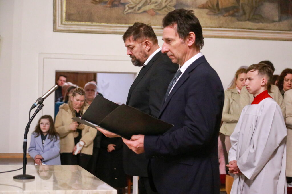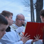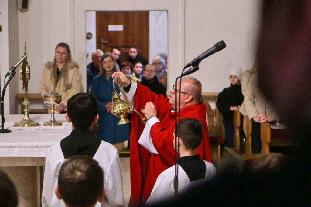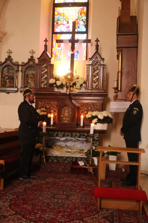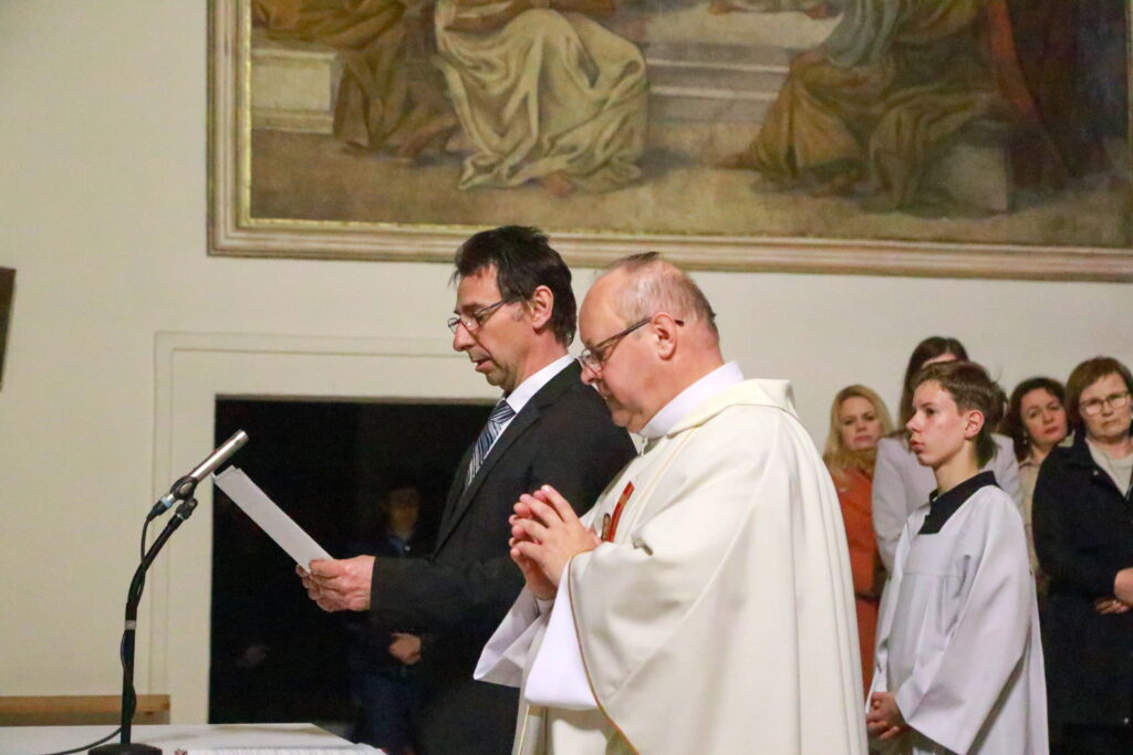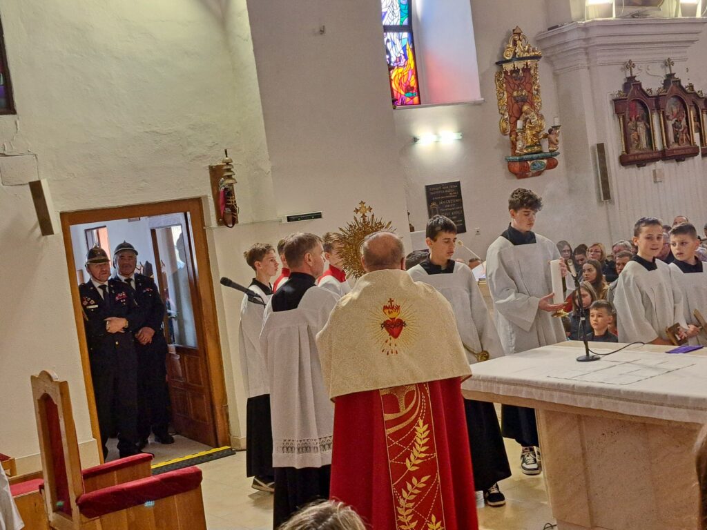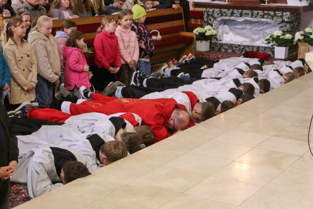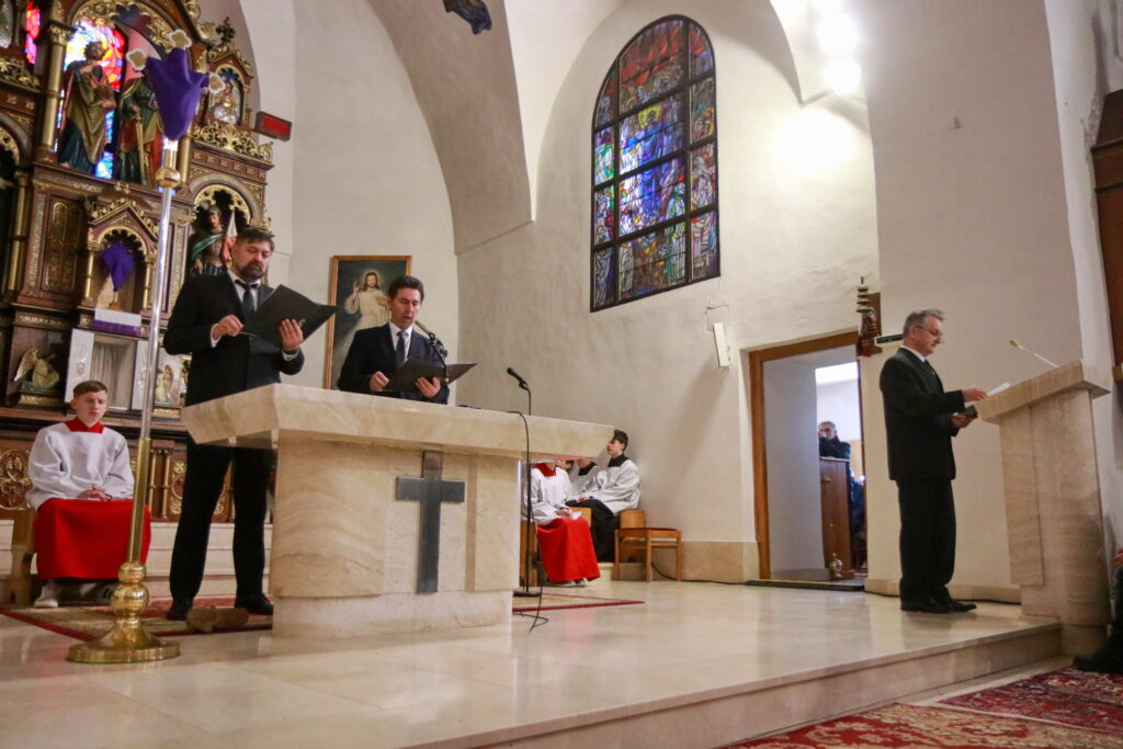 Na Piatok utrpenia Pána (Veľký piatok) sa náš duchovný otec zamyslel: „Pán Ježiš uzdravoval, oživoval ľudí, vracal zrak, pohyblivosť, nasýtil ich….a za čo Ho obvinili a odsúdili? Aj Pilát ostal prekvapený, že si Židia vybrali prepustiť Barabáša.“ Naznačil, že aj my si často vyberáme „Barabáša“ – čokoľvek, čo sa nám núka ako náhrada za Ježiša. Máme si voliť toho, ktorý za nás dal svoj život, pretože aj my sme Ho svojimi hriechmi a nedokonalosťami pribili na kríž. Utrpenie Krista nám v piatkových obradoch priblížili spievané pašie. Silný moment bol aj úvod obradov, keď si pán farár a miništranti ľahli na zem ako vyjadrenie vlastnej biedy a prachu, z ktorého sme povstali, ale zároveň bezhraničnej dôvery v Pána.  To že sa v tento deň nekonala svätá omša, iba obrady, nás upriamuje na ten najväčší skutok Božej lásky k nám. Otec už nemohol urobiť viac než obetovať svojho Syna, aby sme my mohli žiť v slobode.